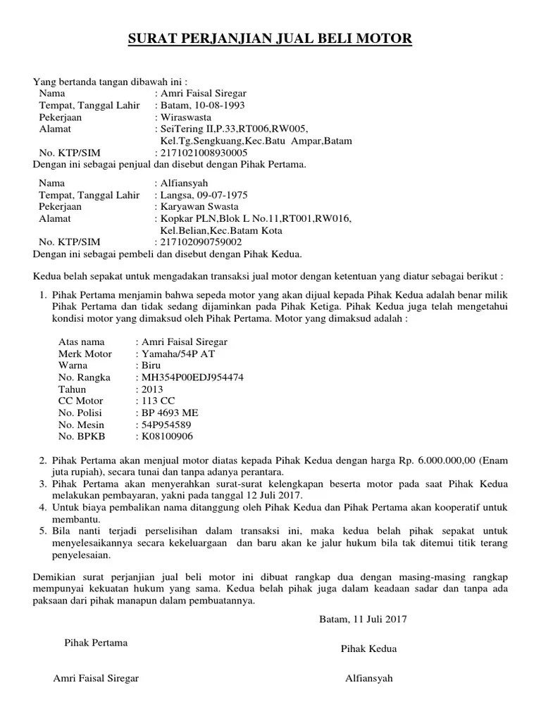 Surat jual beli motor adalah surat atau dokumen penting yang berisi informasi hasil kesepakatan antara penjual dan pembeli dalam melakukan . Contoh surat perjanjian jual beli sepeda motor 01.59 yayat priatna 3 comments uh, ahirnya keburu juga ngepost,, heheheeeeeeeee oh ya, emh post apa yh .